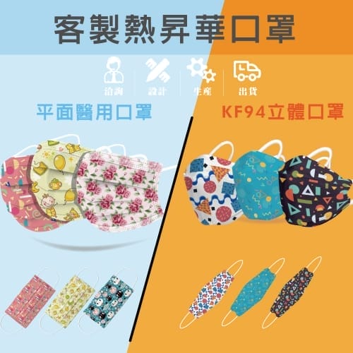本公司專營熱昇華轉印商品服務及轉印代工服務;可供少量印製,快速交貨,免開版。我們與政府立案合格的口罩廠商共同合作,提供客戶最安全、高品質的客製化醫療口罩。無論是一般平面醫療口罩,獅王口罩客製化皆可為您服務。